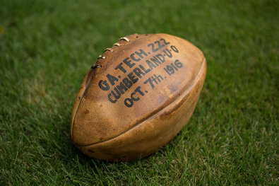 The ball from Georgia Tech’s 222-0 rout of Cumberland in 1916. Tech never threw a pass or recorded a first down because it scored with ease.