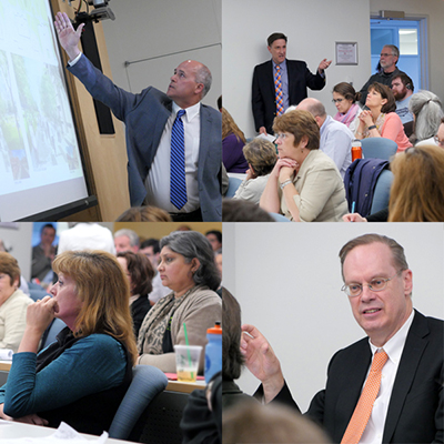 Syracuse University Chancellor Kent Syverud spoke to a group of faculty, staff and students on Tuesday, May 10, at the second of two additional information sessions focused on the proposed University Place Promenade project. The Chancellor, as well as Michael Speaks, dean of the School of Architecture and a member of the Campus Framework Advisory Group, and Peter Sala, vice president and chief facilities officer, also answered a number of questions from the audience of about 60 people.