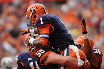 By far our deepest position on either side of the ball. Backing up Rome and PTG, are redshirt freshmen George Morris II (6'0", 203) and Devante McFarlane (6'0", 201), respectively. These two guys can flat-out fly and will see the field this year. Both of them possess breakaway speed that we haven't seen at SU in years. I watched Morris last year at Ft Drum and he was incredible. Fortunately, for both of them, they were able to redshirt last year with PTG and Smith ahead of them. It gave them a chance to get healthy, learn the playbook and get bigger. It has obviously paid off. The future is bright for a long time at RB. This is the deepest stable of quality RB's that I can remember in a long time. Another mystery card in all of this is former highly touted true junior Adonis Ameen-Moore (5'11", 239). He saw time last year as the TANK tailback scoring 5 tds, but has always struggled with his weight. The new staff moved him to fullback, which will be anchored by senior Clay Cleveland (6'1", 230). The best scenario for Moore this year would for him to redshirt. He is not going to see any time at RB with Smith as the power back, and more importantly, we will need a bruiser once Smith is likely gone next year. By redshirting, it would give AAM 2 more years of eligibility starting next year. All in all, this unit gets an A. Looking forward to Smith AND possibly PTG both going over 1,000 yards this year.